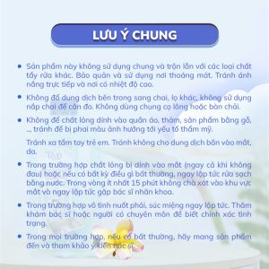Sản phẩm này không sử dụng chung và trộn lẫn với các loại chất tẩy rửa khác.Không đổ dung dịch bên trong sang chai, lọ khác, không sử dụng nắp chai để cân đo. Không dùng chung cọ lông hoặc bàn chải.