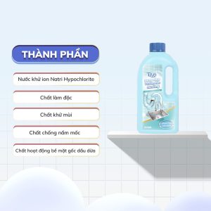 – Thành phần: Nước khử ion, Natri Hypochlorite, Natri Hydroxide, chất hoạt động bề mặt gốc dầu dừa, chất làm đặc, chất khử mùi, chất chống nấm mốc, tinh dầu.
